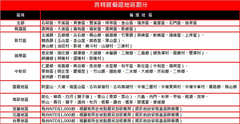 ※偏遠地區運送需加收運費600元/台,東部地區收費1,000元/台外,視顧客所在地點需另加收費用(將於約訪安裝產品時報價)。