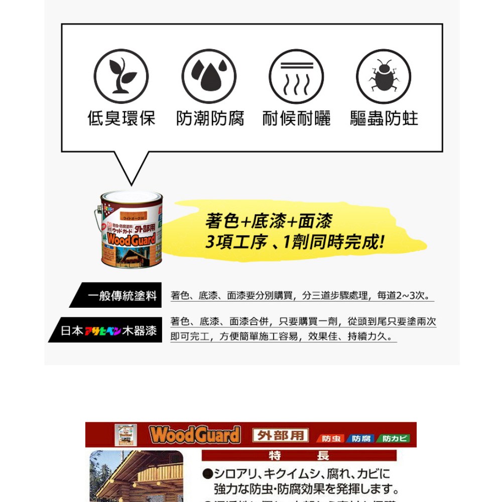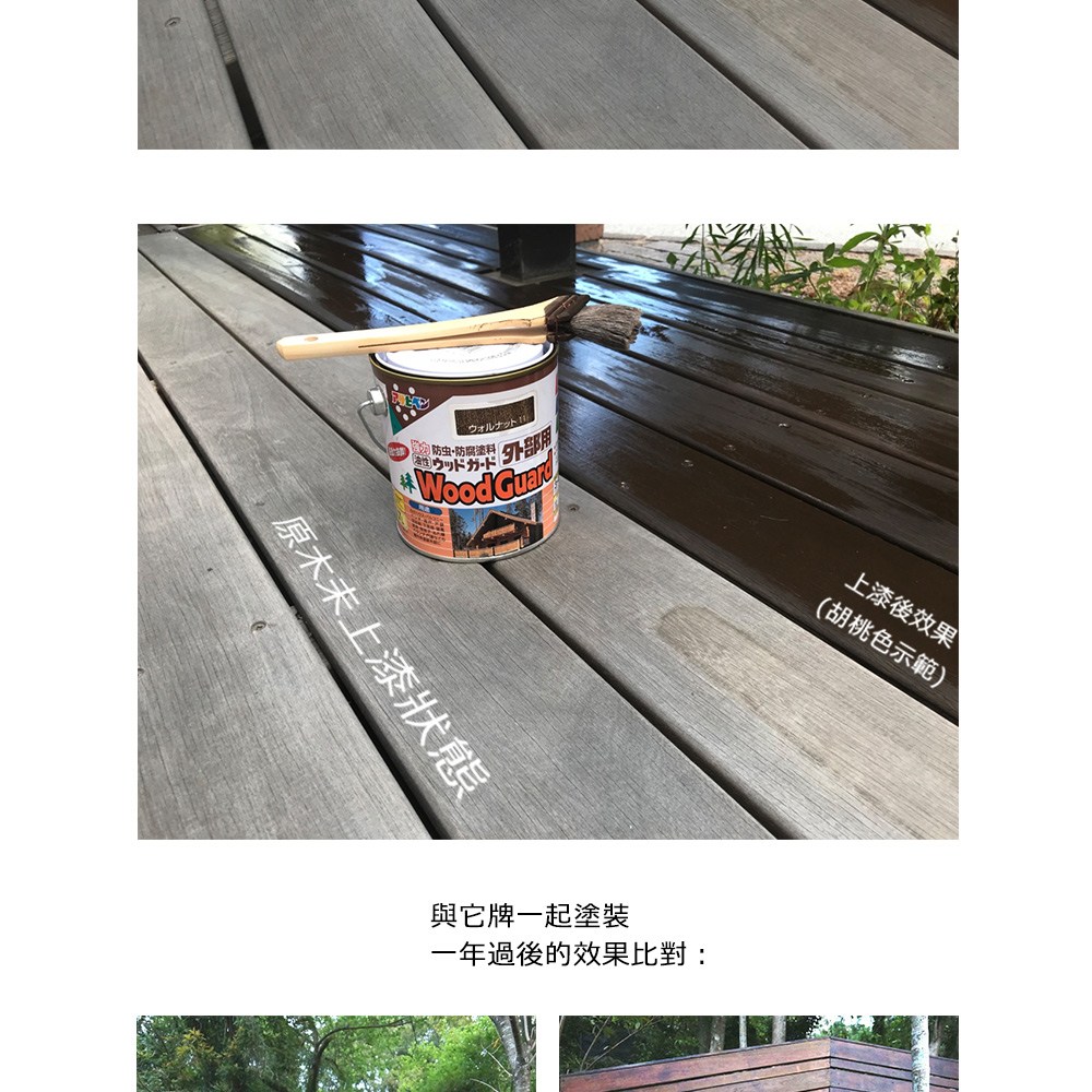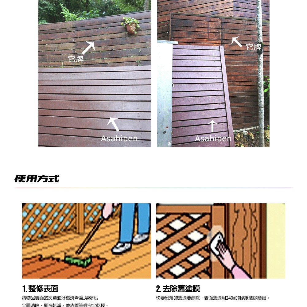 用途:室外木製品如小木屋、木作別墅、閣樓及住宅、倉庫、庭園資材休憩木桌椅及陽台木製設備、木甲板、木製門窗、木格窗等。註:未塗裝的木品可漆到完全效果。已塗漆過的木品建議先磨除表面塗膜效果較好