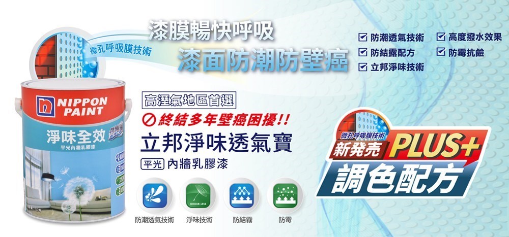 立邦淨味「透氣寶」是專對潮濕多雨天候開發,以獨特「微孔呼吸漆膜」及「防結露配方」等「防潮透氣技術」,提供您預防及降低壁癌發生機率的新形態產品。此外,淨味「透氣寶」以無添加香精的「IPS+淨味技術」、高度撥水效果、加強抗鹼防黴,能強化預防壁癌發生的機會,保持潔淨居家環境,更能維護家人健康。
