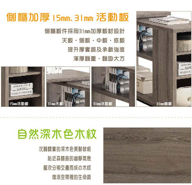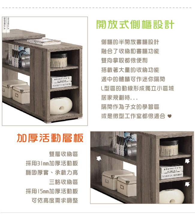 內建兩小一大抽屜櫃,高品質滑軌設計,開放式側櫃,融合收納櫃及書櫃功能,31mm加厚活動板(1大片)/15mm加厚活動板(2小片)均可自由調整高度。