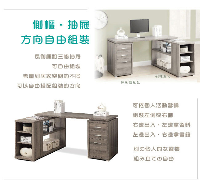 長側櫃+三格(兩小一大)抽屜櫃,可依使用習慣而相互換方向組裝。