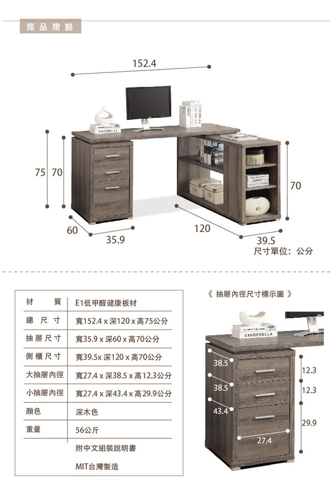 創立40年金商獎廠商所推出的現代板式D.I.Y組合傢俱(Knock-down furniture)-康迪仕(COMDESK)系列,採E1環保健康板材製造,L型款複合式電腦書桌,超大桌面、下方側邊開放式收納空間與抽屜的搭配,為書桌發揮最大功能。