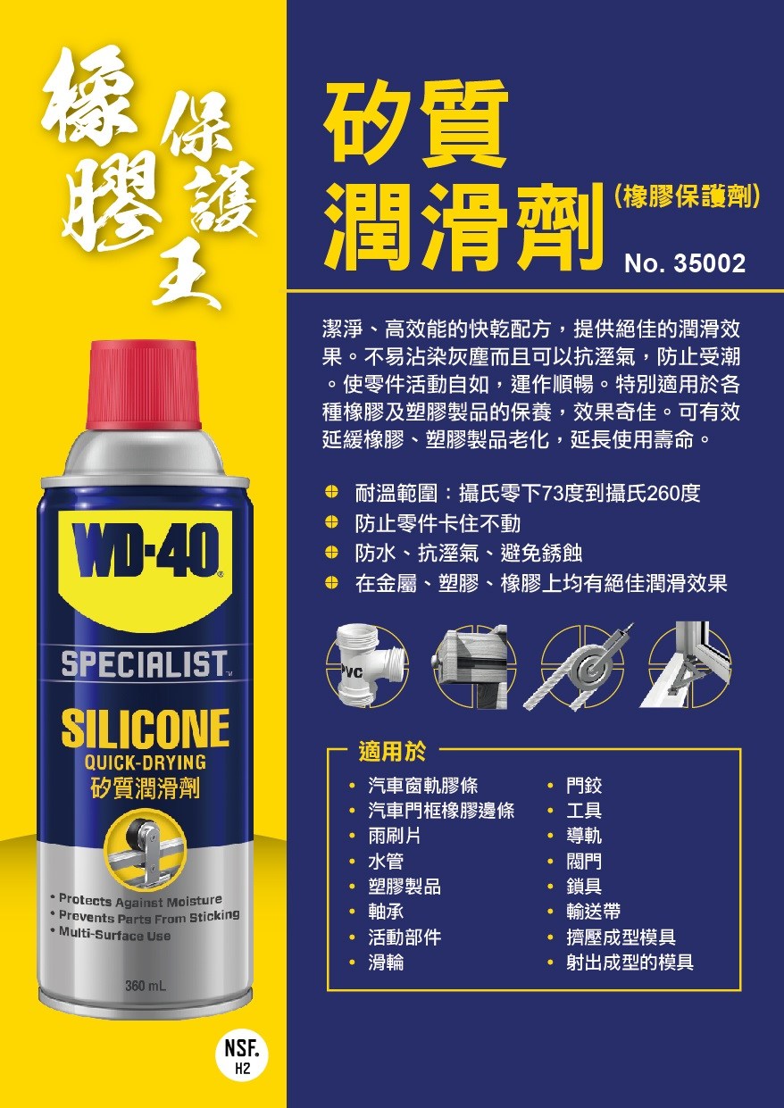 美國知名潤滑劑品牌推出的【WD-40 Specialist 快乾型矽質潤滑劑(橡膠保護劑)】讓您有效保持金屬、塑膠、橡膠潤滑效果,採用不沾污的高效能配方,不易沾染灰塵,對於橡膠的保護效果奇佳,能有效防水抗濕氣,防止受潮,其耐溫範圍於攝氏零下73度到攝氏260度,有效消除尖銳的聲響及難除黏著物的困擾,快乾型特性,不會在表面留下污漬,可以保護金屬及塑膠、橡膠表面,可使用於保養雨刷片及電動窗旁之橡膠保護片。適用于各式金屬與塑膠材質,門鎖、鉸鏈、鏈條、鏈齒、風扇等滑動幾件。