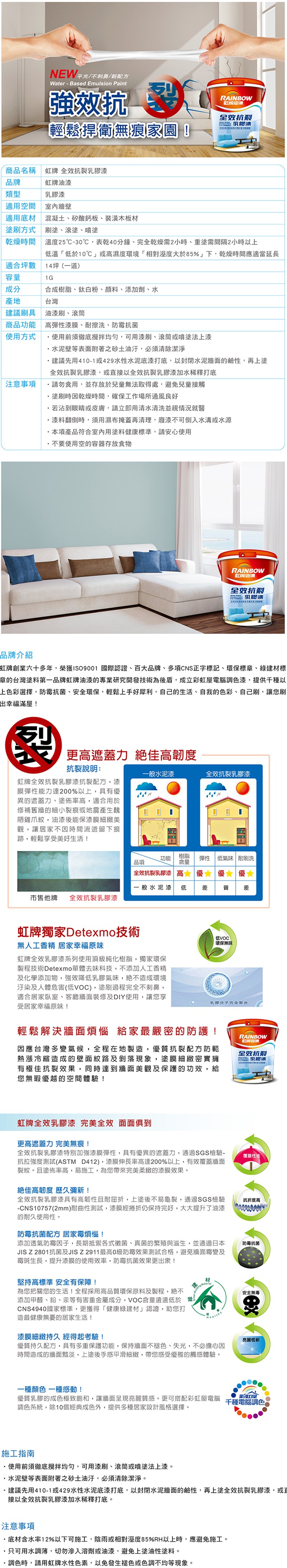全效抗裂乳膠漆採用先進低氣味樹脂,不但有效抗裂,不刺鼻安全配方,不添加甲醛、鉛、汞、重金屬,使家環境更安全。乳膠漆乾燥後,即使牆壁弄髒或留下手紋、灰塵時,用抹布擦一下就能夠輕鬆清潔表面污漬。全效抗裂乳膠漆優越的耐水性及耐刷性,經過洗刷測試達3萬次以上(CNS要求1萬次以上),壁面仍然不受損壞,依舊亮麗如新居家清潔更方便,色彩光澤柔和持久。