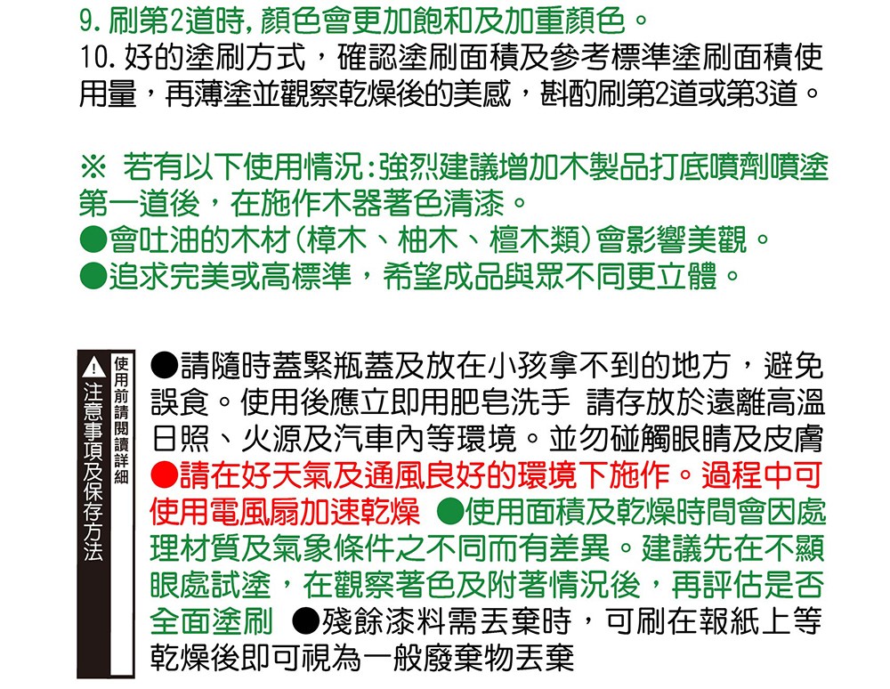 適用於:木製品、木製工藝品、室內木製家具、門板、門框設備及木類建材(地板除外)