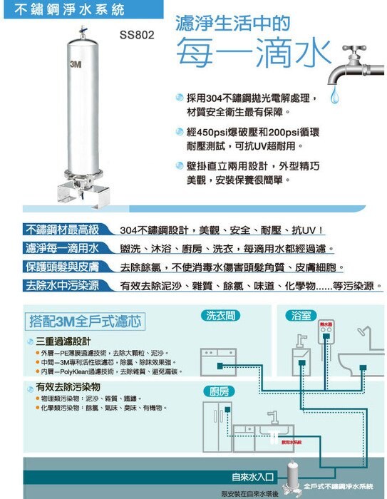 3M™全戶式不鏽鋼淨水系統 SS802,採用304不鏽鋼設計,安全、耐壓且抗UV,極為適合台灣居家安裝環境。搭配3M™全戶式活性碳濾芯AP817-2,採三重過濾設計,可去除泥沙、雜質、鐵鏽等物理性汙染物,以及餘氯、異味與臭味、有機物等化學性汙染物。