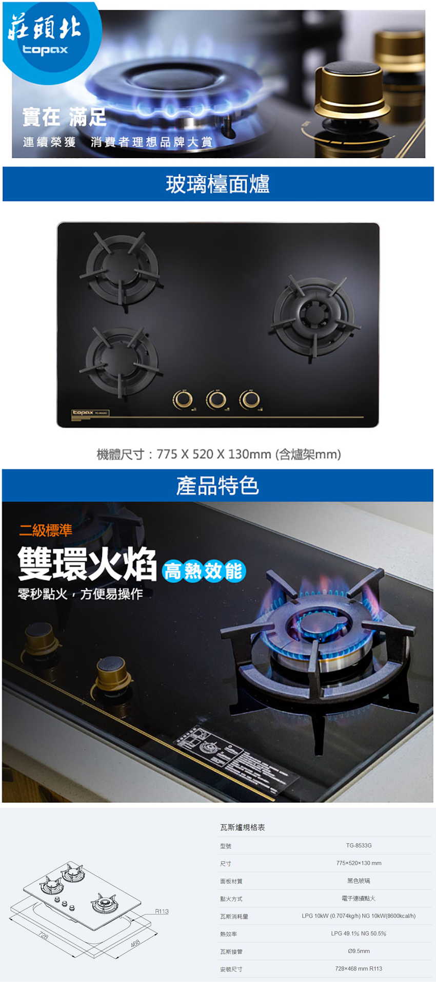 此款【TG-8533G(NG1)莊頭北三口玻璃檯面爐天然(左二右一)能率二級】具備熄火安全裝置安全有保障;黑色玻璃面板好清潔易搭配廚具。用金點綴,整體質感再提昇,體現極緻的品味~