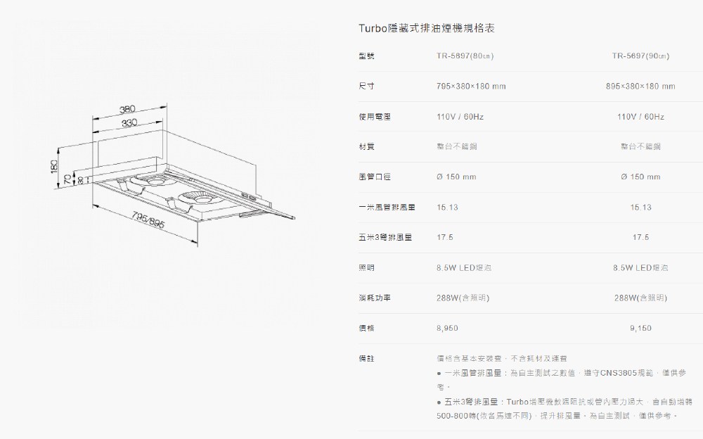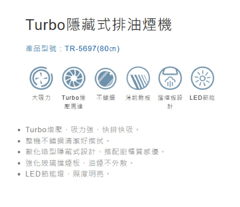莊頭北 80cm 不鏽鋼 隱藏式 排油煙機 Turbo馬達 TR5697SL