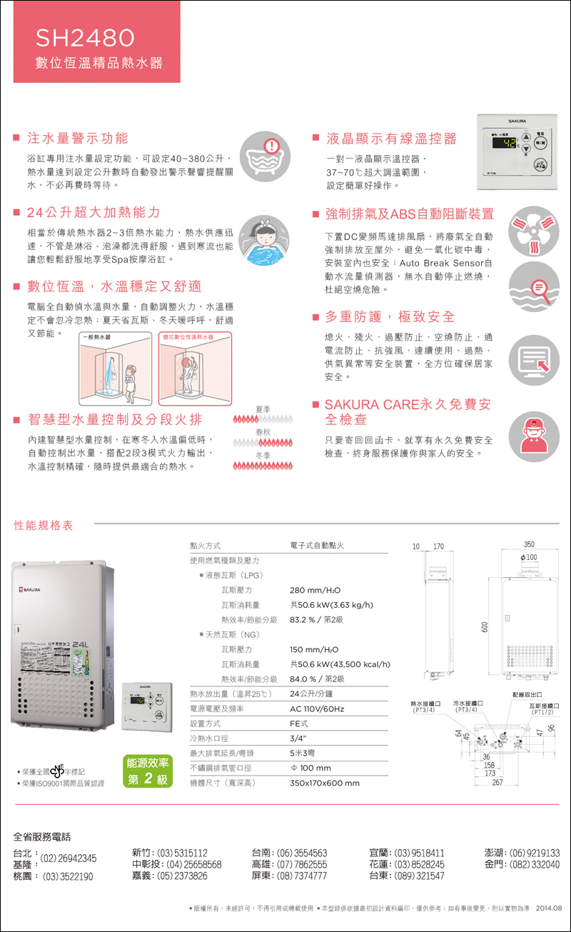 本款【櫻花 數位強制排氣熱水器 24L SH-2480 NG1/FE式 天然】擁有 :