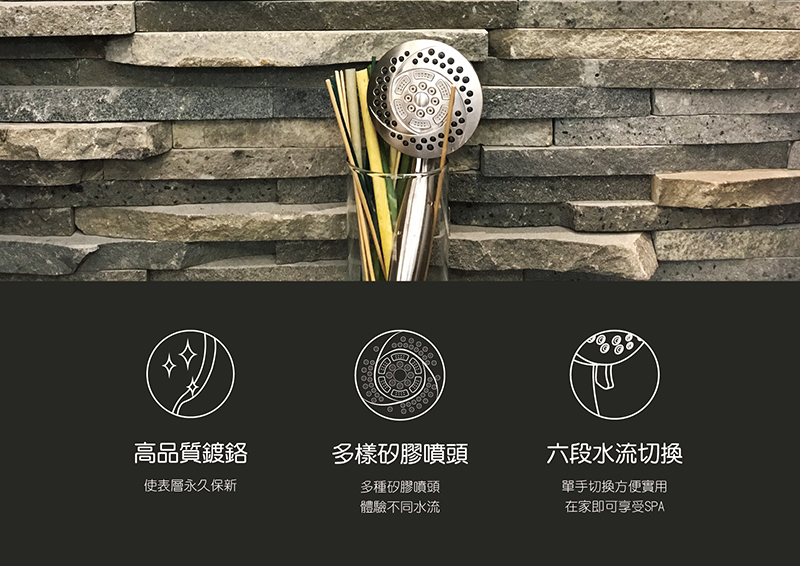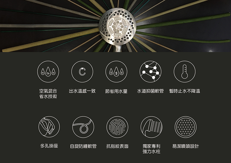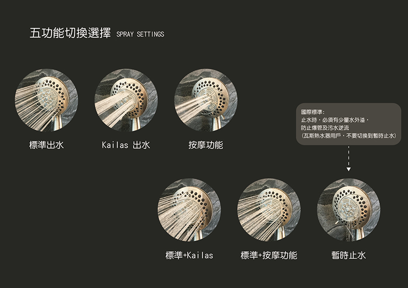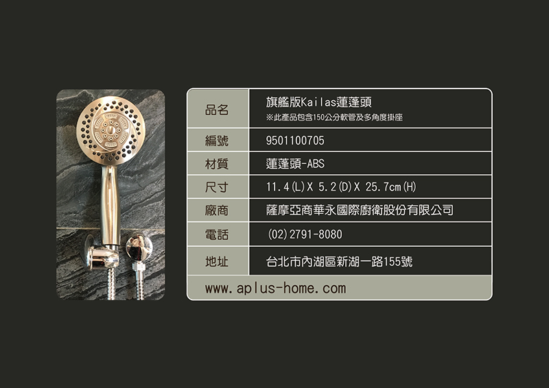 本款【AquaSync 水美樂生活 旗艦 Kailas 蓮蓬頭 (軟管掛座附屬) [六段功能切換]】給您六功能切換選擇,獨家強力水柱專利,水柱集中,衝擊力強。自旋防纏軟管讓您水管壽命增強,其多孔掛作讓您選擇適合的角度與高度,讓您不需要出去花大錢就可以自己在家裡享受到SPA的待遇,充分的感受舒適放鬆的淋浴魅力。