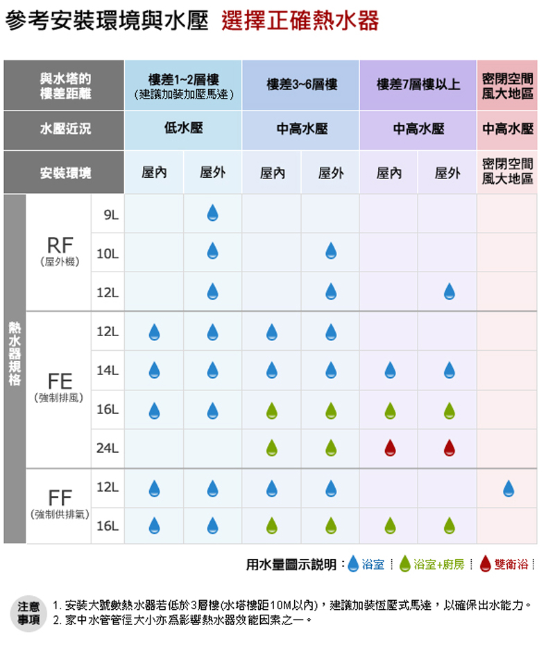 1.安裝位置於屋內或陽台有加裝窗戶、紗網、百葉窗、天井及鐵欄杆、在陽台晒衣服,請務必選擇安裝”強制排氣”瓦斯熱水器(FE式)!
