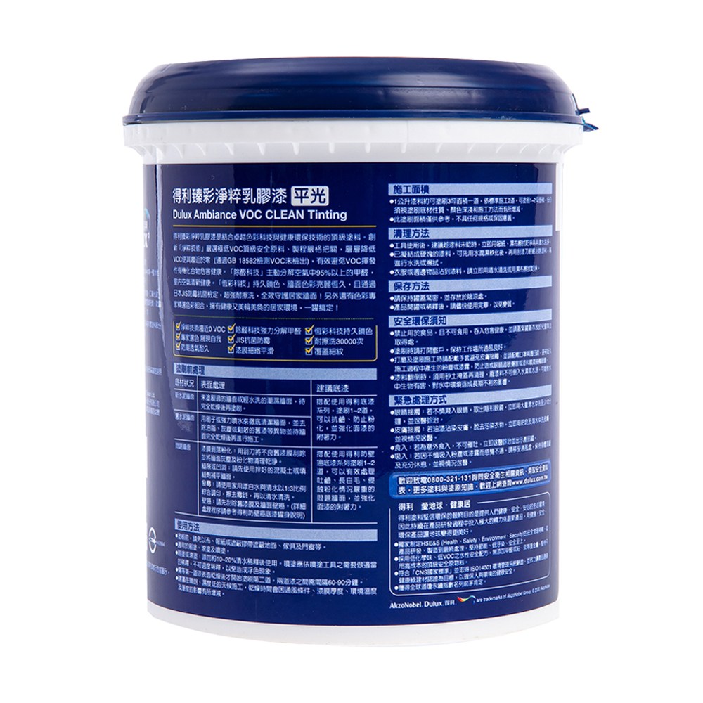 這款【Dulux 得利 臻彩淨粹乳膠漆平光系列】採用低化學味、低VOC(有機揮發物)之頂級安全原料及功能添加劑,成份安全環保,加上水性環保配方不添加甲醛及鉛、汞等重金屬,使用更安心~ 獨特的高透氣漆膜微孔結構,漆膜透氣性佳,牆體中水氣容易逸散,提昇牆面防潮性!漆膜平滑,灰塵不易吸附,抗污耐擦洗,灰塵、醬料、水性墨水等髒汙,用海綿沾少許清潔劑及水即可輕鬆擦拭。