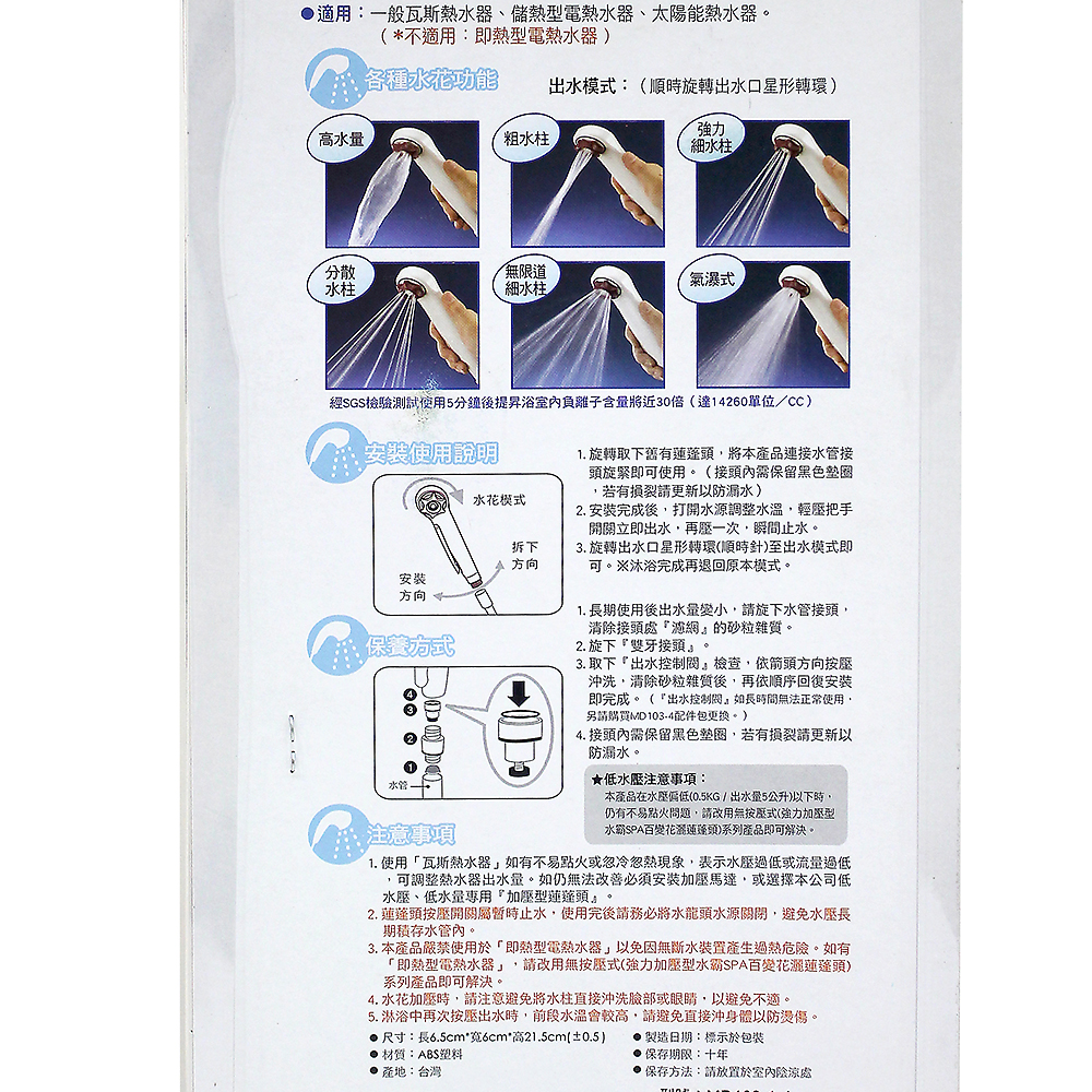 兩段式按壓把手 獨特濾網不阻塞您是否在尋找一款時尚大方又節能省水的蓮蓬頭呢?為您推薦這款【多益得按壓式百變蓮蓬頭(升級版)】,全新升級版按壓式百變蓮蓬頭,出水變化為無段式微調,水花的變化可自由選擇,只要輕輕旋轉出水口的星行轉環,即可創造出各種不同的出水變化,讓您不用出門也可享受做SPA的感覺喔!符合人體工學之出水角度設計與強力水柱及氣霧式水花之巧妙轉換,讓您享受按摩水柱、氣霧水花及負離子氣瀑的變化。經國家測試取得省水標章,最高省水可達70%以上,推薦您使用既舒適又環保的活氧百變蓮蓬頭。