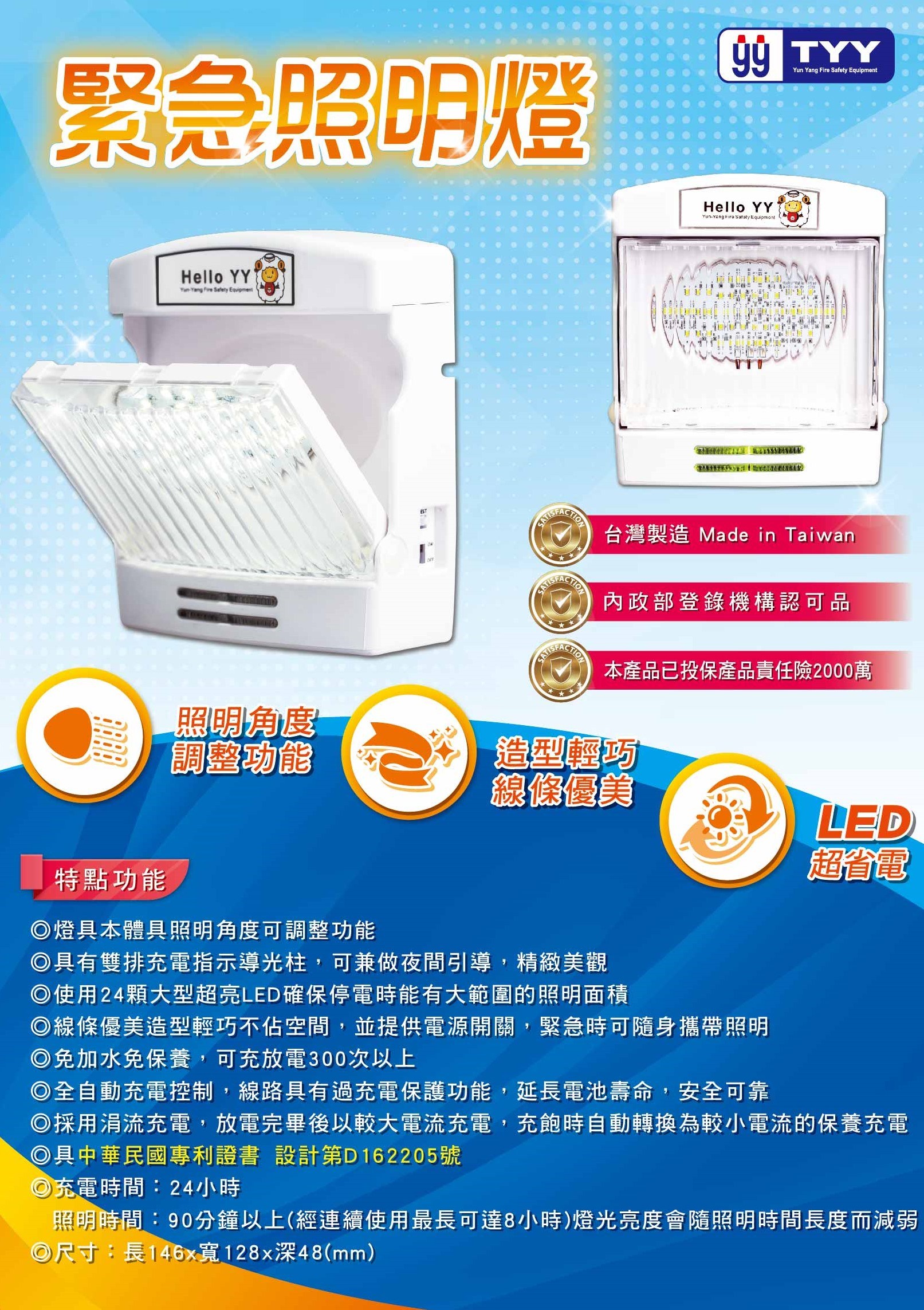 【專利LED緊急照明燈(90分鐘以上)(消防屬認證)】照明角度可調整, 當颱風、地震、意外事故發生而導致停電時,更利於逃生、救人及滅火行動, 使生命財產的損失降至最低,全自動充電及切電控制,延長電池壽命,並且採用涓流充電,放電完畢後以較大電流充電,充飽時自動轉換為較小電流的保養充電,照明時間達90分鐘以上(經連續使用最長可達8小時,燈光亮度會隨照明時間長度而減弱),使用更加安全可靠。