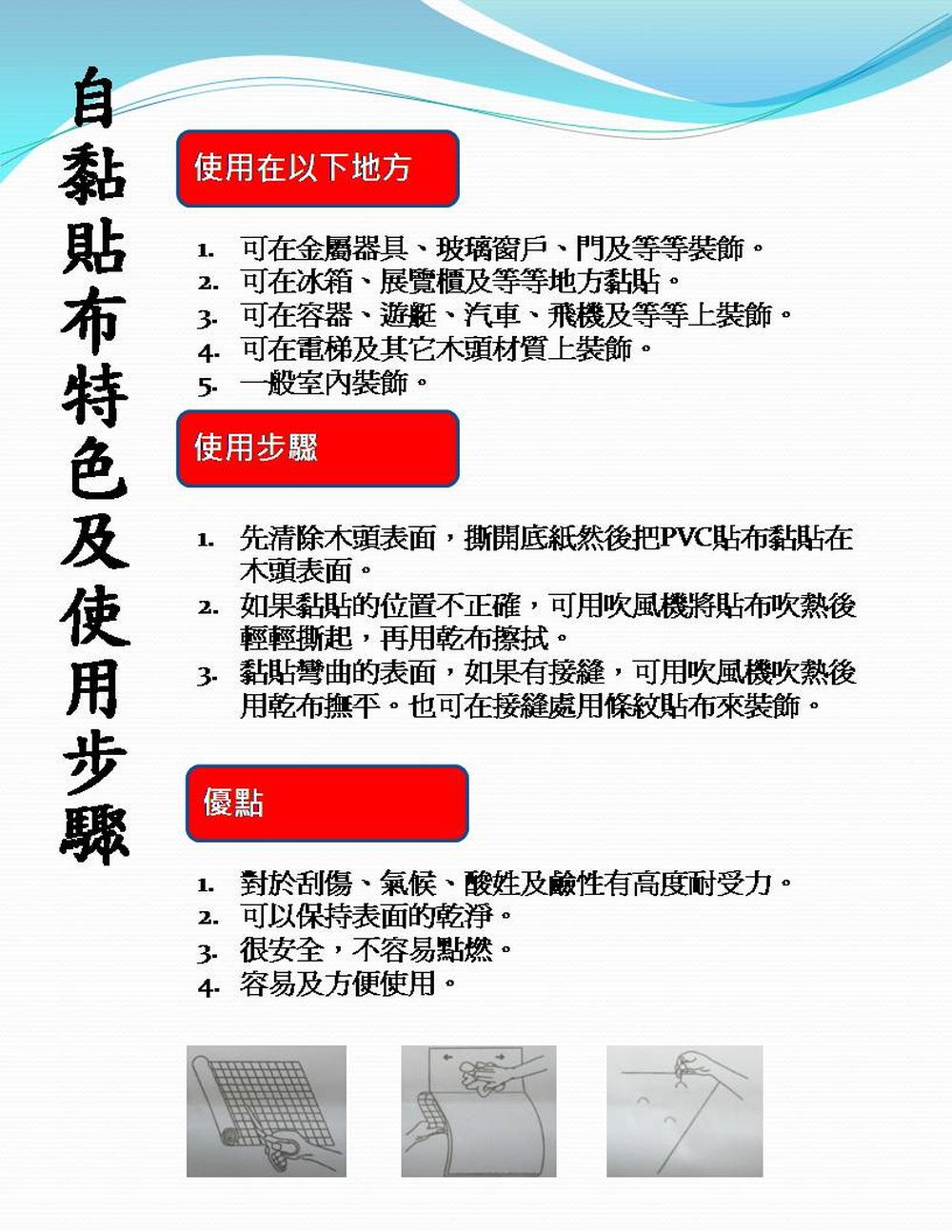 自黏背膠裡紙有方格尺寸供自由剪裁.使用方法請參照裡紙中文說明.勿貼於高溫處
