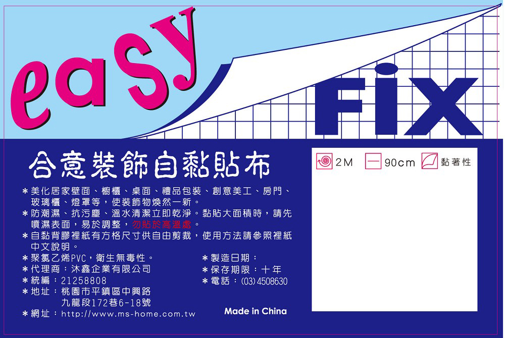 自黏背膠裡紙有方格尺寸供自由剪裁.使用方法請參照裡紙中文說明.勿貼於高溫處