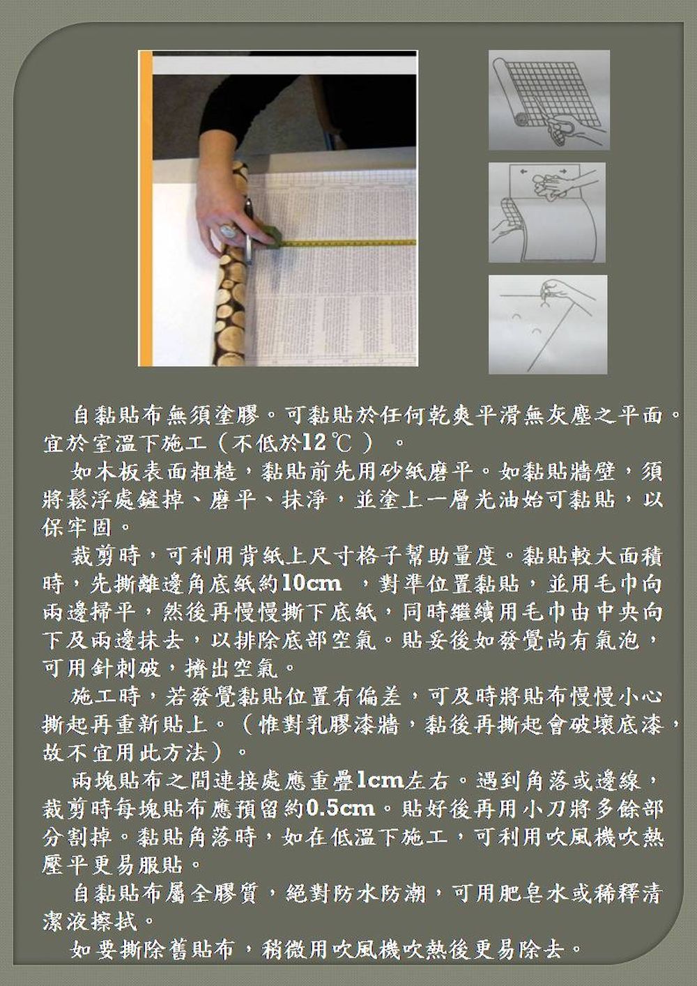 自黏背膠裡紙有方格尺寸供自由剪裁.使用方法請參照裡紙中文說明.勿貼於高溫處