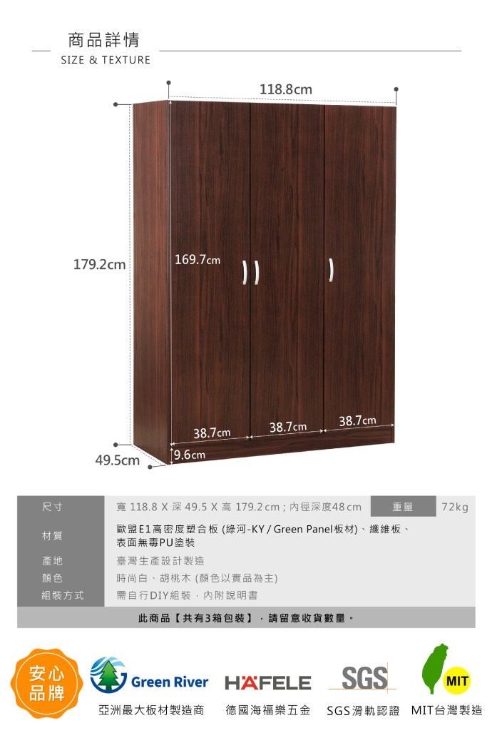 《HOPMA》美背工業風三門衣櫃 台灣製造 衣櫥 收納櫃 衣物收納櫃-白櫻桃