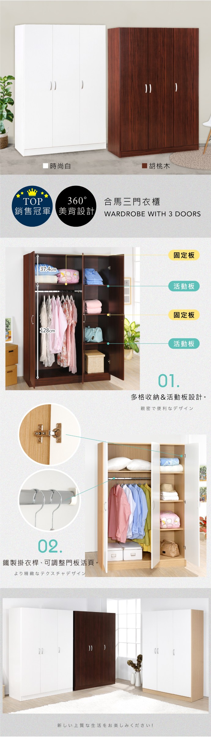 《HOPMA》美背三門衣櫃 台灣製造 衣櫥 收納櫃 衣物收納櫃-時尚白