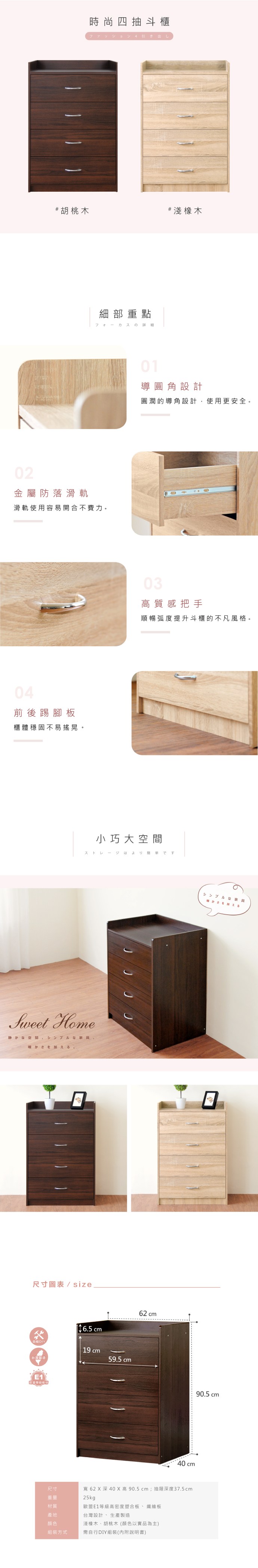 《HOPMA》美背伍德實木腳四抽斗櫃 台灣製造 床頭櫃 抽屜櫃 衣物收納櫃 邊櫃-淺橡(漂流)木