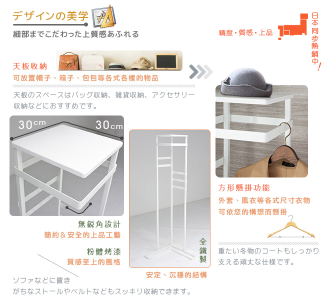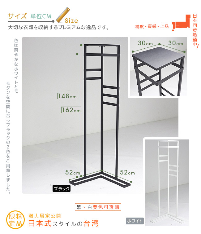 走入生活,感受到實木的溫潤質感,打造新生活美學,極簡外型加一點新設計,打造超質感居家,賦予家最單純的模樣與情感。台灣製造,外銷日本,品質良好,整座金屬粉體烤漆材質,適合台灣海島型氣候,潮濕的氣候衣服久放衣櫥內容易有股霉味,【C'est Chic】小室革命衣架開放式的設計,無銳腳方形吊掛功能,可作為掛衣架或室內曬衣架用途,不再有發霉的問題產生,無論擺放T-SHIRT、襯衫、外套、裙裝、褲裝一目瞭然。善用轉角空間無論吊掛衣服或是置物,完全不浪費居家空間!