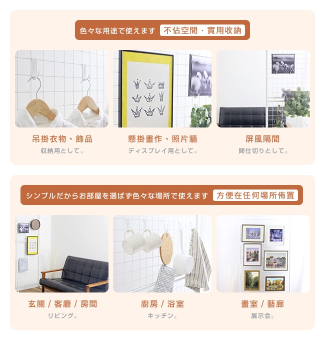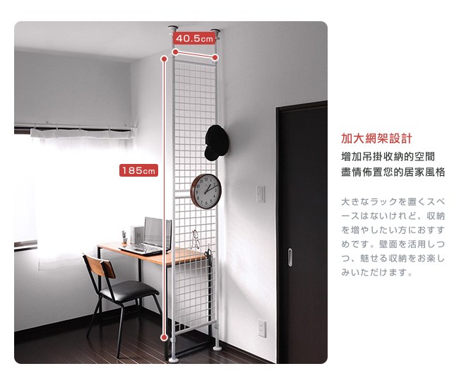 台灣製造,日本同步販售。不佔空間,實用收納,安裝高度的範圍215~312cm。可佈置於玄關、客廳、房間、廚房、浴室、畫室、藝廊。使用日規頂天防震固定器,專為耐震防落的彈簧結構,讓收納網架彈性緩衝,吸收震動,更加安全穩固,不易傾倒。支架獨立可調高度,能在不同高度落差下(如樑柱)安裝收納架。內六角螺絲,相對十字形螺釘,它有六個受力面,能鎖的更緊密不滑牙,結構更加牢固。加大網架設計,增加吊掛收納的空間,盡情佈置您的居家風格。附贈日規掛鉤10入,與S掛鉤不同,它不會搖晃,方便吊掛物品不掉落,每一個承重 0.5kg。