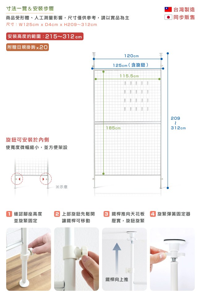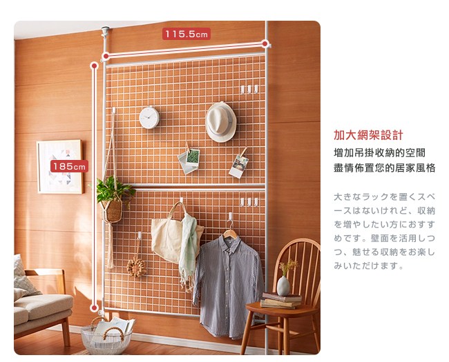 台灣製造,日本同步販售。不佔空間,實用收納,安裝高度的範圍215~312cm。可佈置於玄關、客廳、房間、廚房、浴室、畫室、藝廊。使用日規頂天防震固定器,專為耐震防落的彈簧結構,讓收納網架彈性緩衝,吸收震動,更加安全穩固,不易傾倒。支架獨立可調高度,能在不同高度落差下(如樑柱)安裝收納架。內六角螺絲,相對十字形螺釘,它有六個受力面,能鎖的更緊密不滑牙,結構更加牢固。加大網架設計,增加吊掛收納的空間,盡情佈置您的居家風格。附贈日規掛鉤20入,與S掛鉤不同,它不會搖晃,方便吊掛物品不掉落,每一個承重 0.5kg。