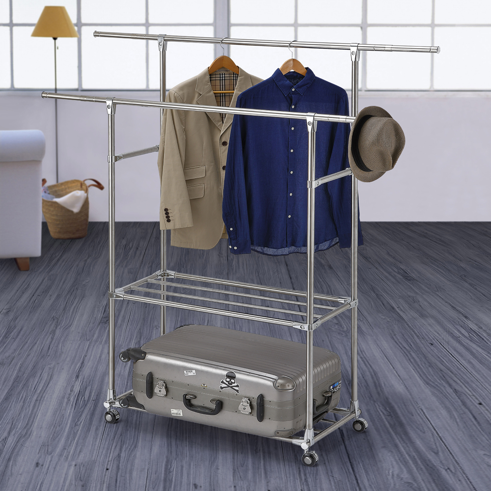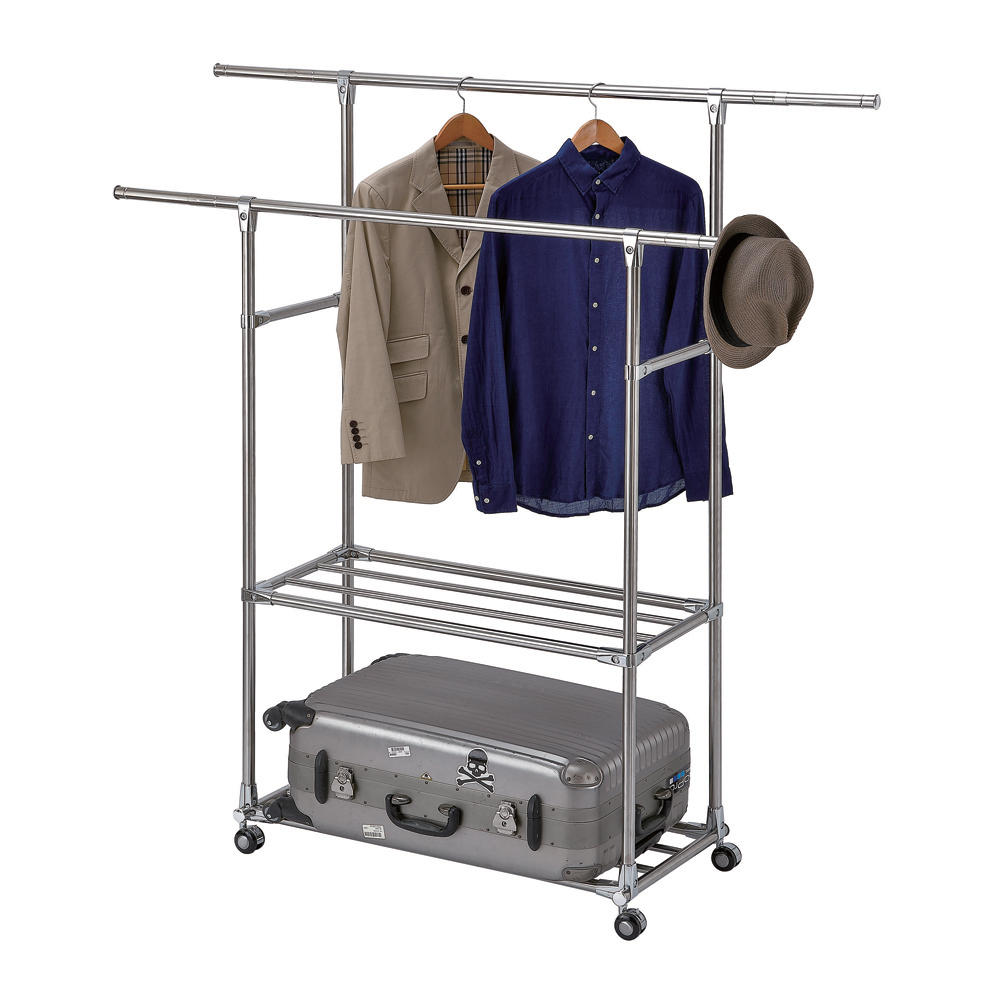 【居家cheaper】不鏽鋼移動式伸縮雙桿衣架(附輪組)不鏽鋼