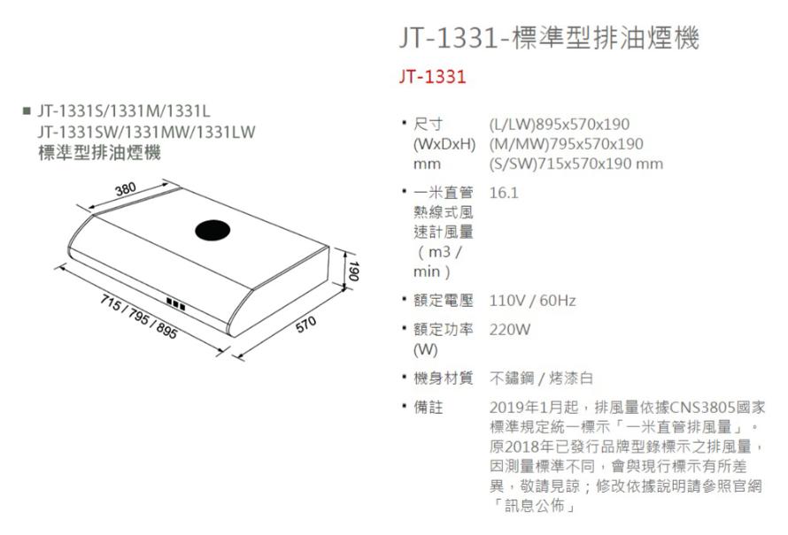 JT-1331L喜特麗ST標準型90CM排油煙機