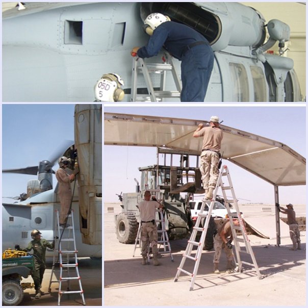 航用梯不同於萬用梯的地方,主要在兩點.一是它的承載重量有136公斤,高於萬用梯的115公斤.它的鋁材用的是最高等級的鋁材6005-T5.它的梯腳採用防滑設計, 適用於飛行載具落地在很特殊不平的表面時, 或者是在冰天雪地的狀況,這樣的梯腳可以讓梯子可以穩固的放到表面,在緊急迫降時,讓上面的乘客或者是飛行員可以安全下來.一般的使用者建議使用萬用梯就很耐用.