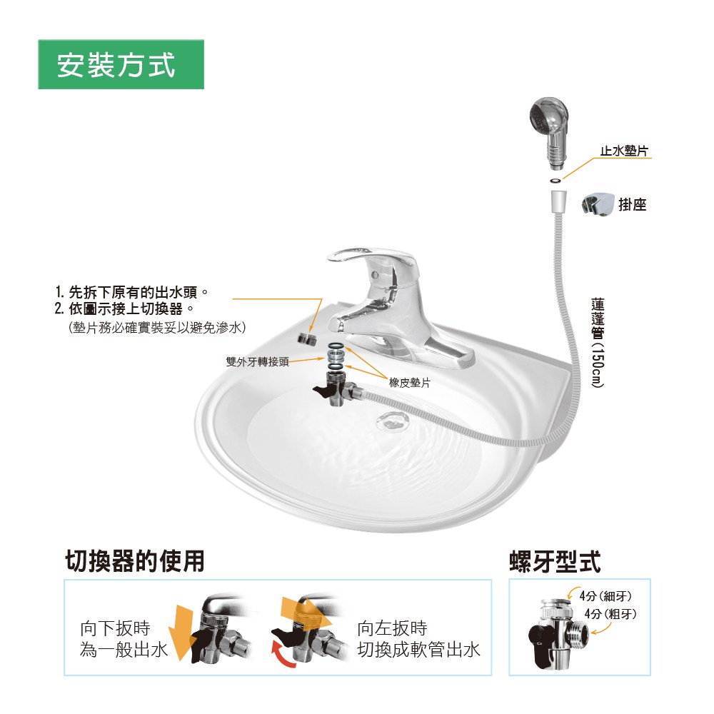 此款【不鏽鋼面盆沐浴雙用組】可安裝於面盆龍頭出水口.切換不同的使用模式;不鏽鋼耐高壓管.表面鍍鉻質感佳。