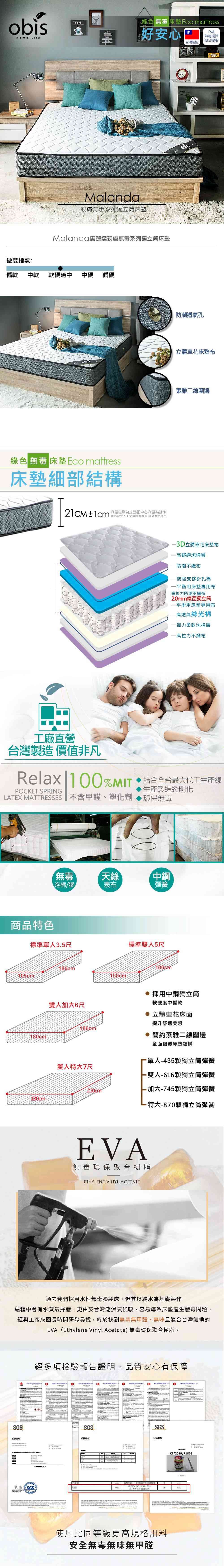 【obis】Malanda親膚無毒系列雙人特大6X7尺獨立筒床墊(21cm)