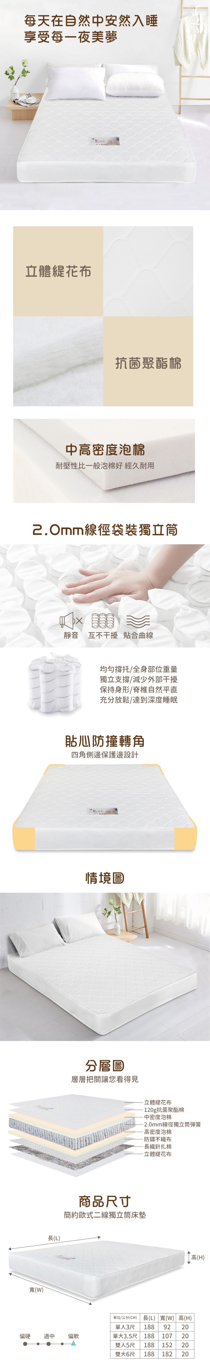Albert艾柏 抗菌透氣3.5尺單人獨立筒床墊(3.5x6.2尺)-105x188x25cm