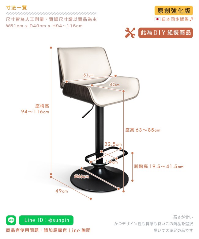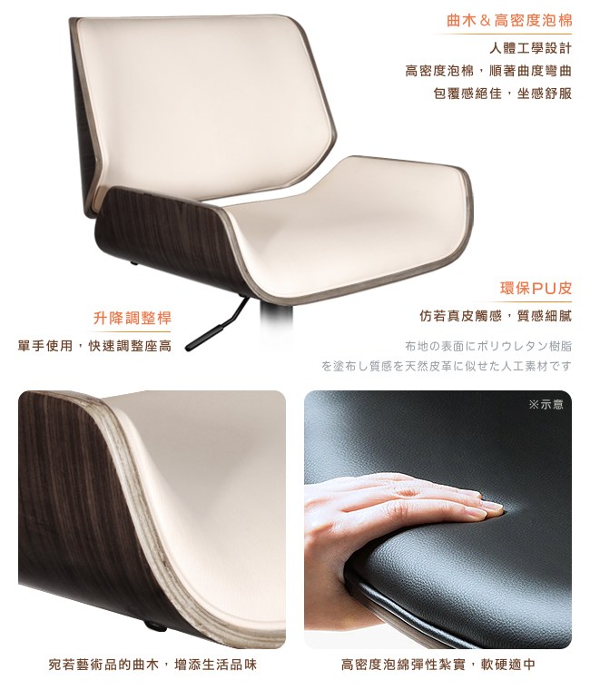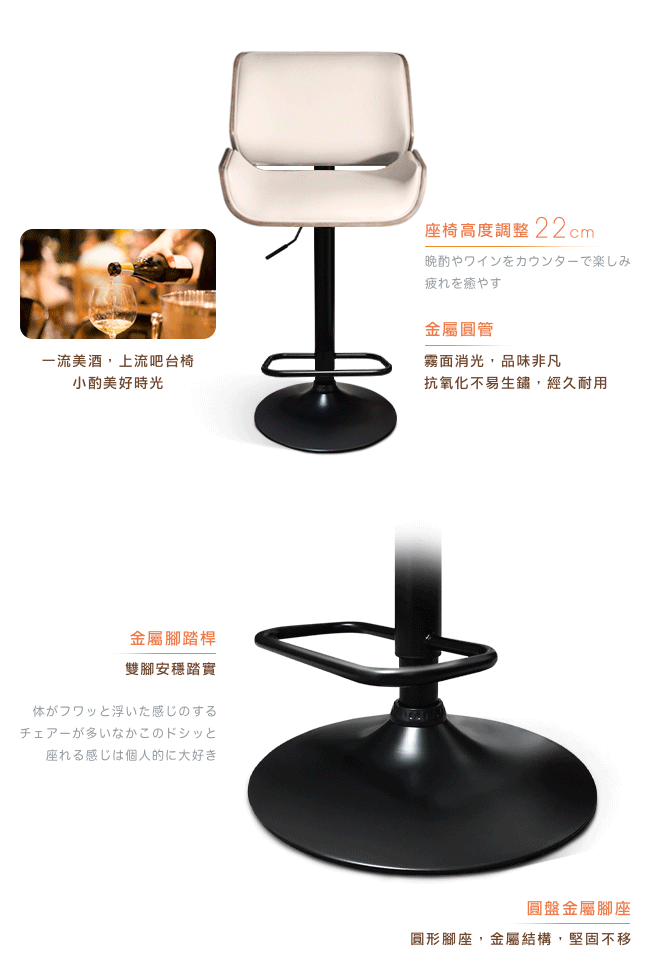 挑高的吧台椅,與眾不同的格調,提升用餐的氛圍。非常適合與廚房中島搭配,不佔空間,可以一邊料理美味食材,一邊與家人朋友談天說地,自然而然拉近彼此的距離。曲木的藝術設計與高密度泡綿,絕佳的包覆感,坐感舒適,久坐不累。環保 PU 皮,仿若真皮觸感,質感細膩。金屬霧面消光圓管,品味非凡,且抗氧化不易生鏽,經久耐用。隨個人喜好與身高,吧台椅可調高度 22cm,金屬腳踏桿方便雙腳踩踏。底座軟質止滑墊增加抓地力,更加安全牢固,且可避免刮花地板。