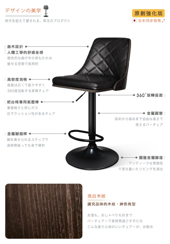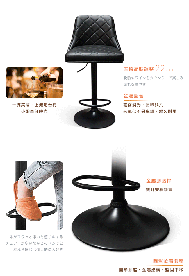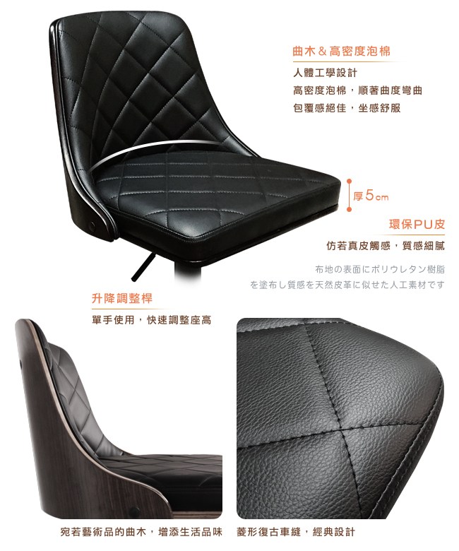 挑高的吧台椅,與眾不同的格調,提升用餐的氛圍。非常適合與廚房中島搭配,不佔空間,可以一邊料理美味食材,一邊與家人朋友談天說地,自然而然拉近彼此的距離。曲木的藝術設計與高密度泡綿,絕佳的包覆感,坐感舒適,久坐不累。環保 PU 皮,仿若真皮觸感,質感細膩。金屬霧面消光圓管,品味非凡,且抗氧化不易生鏽,經久耐用。隨個人喜好與身高,吧台椅可調高度 22cm,金屬腳踏桿方便雙腳踩踏。底座軟質止滑墊增加抓地力,更加安全牢固,且可避免刮花地板。