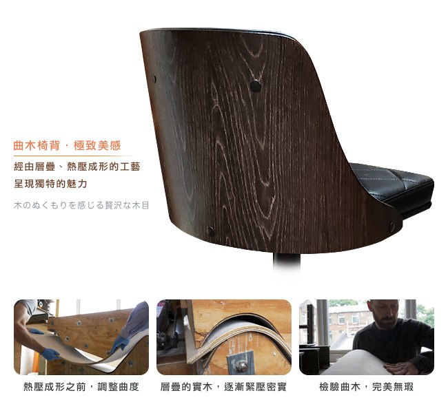 使用多層薄木板,以膠貼合後,熱壓彎曲而成。曲木家具線條自然,保持完整的木材紋理。在多層熱壓成型後,並不因此損壞木材纖維結構,具抗潮、抗扭、不開裂、不變形、經久耐用等優點。