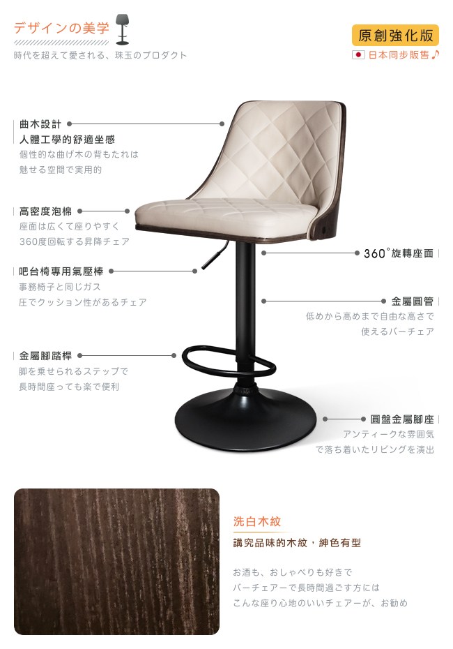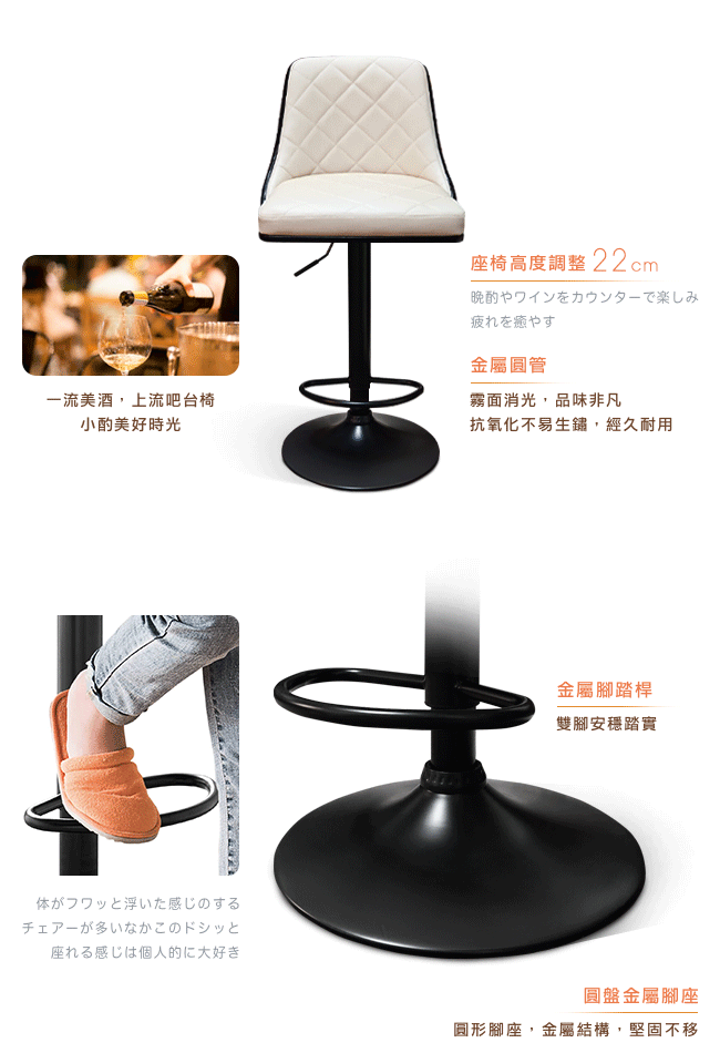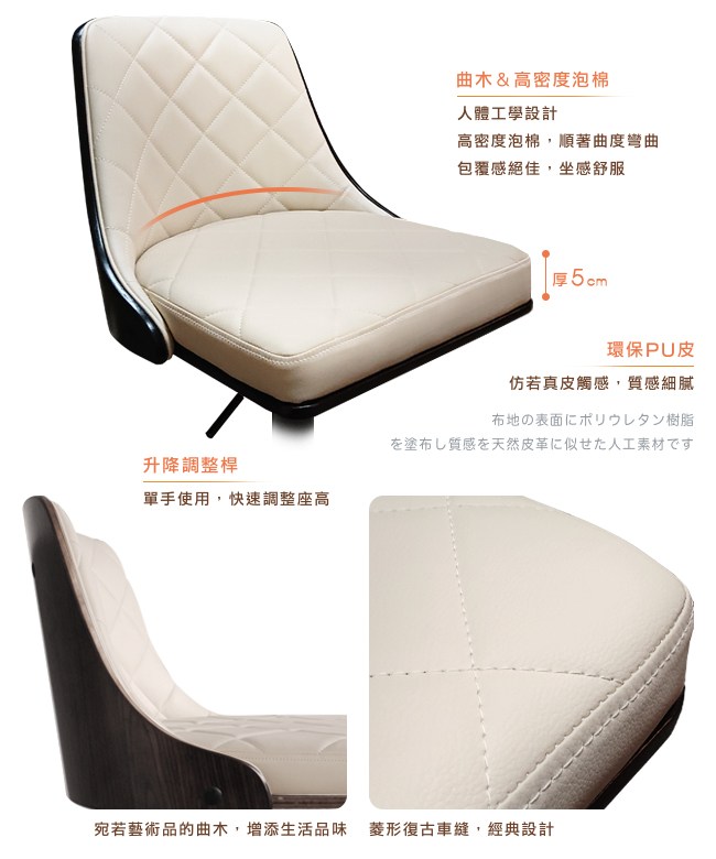 挑高的吧台椅,與眾不同的格調,提升用餐的氛圍。非常適合與廚房中島搭配,不佔空間,可以一邊料理美味食材,一邊與家人朋友談天說地,自然而然拉近彼此的距離。曲木的藝術設計與高密度泡綿,絕佳的包覆感,坐感舒適,久坐不累。環保 PU 皮,仿若真皮觸感,質感細膩。金屬霧面消光圓管,品味非凡,且抗氧化不易生鏽,經久耐用。隨個人喜好與身高,吧台椅可調高度 22cm,金屬腳踏桿方便雙腳踩踏。底座軟質止滑墊增加抓地力,更加安全牢固,且可避免刮花地板。
