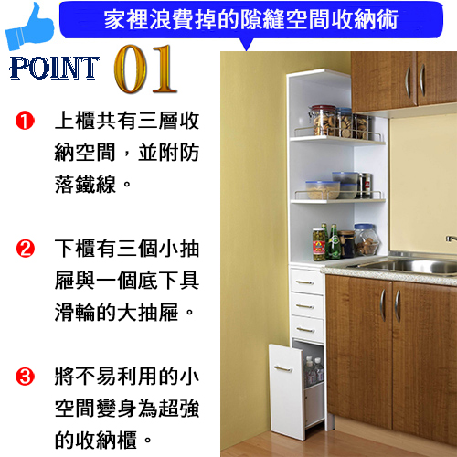 您的流理台和冰箱或牆壁間留有一個不大不小的空隙嗎?除了堆積雜物、影響美觀之外,也不能做其它的利用!那麼,您一定需要這一款【超強功能隙縫收納櫃】,只要將它置於廚房流理台與冰箱或牆壁之間的縫隙,甚至或任何有隙縫的角落,就可以將原本棄置不用的小空間變身為超強的收納櫃!