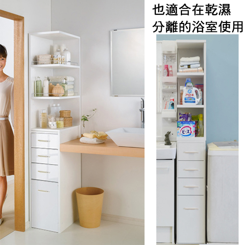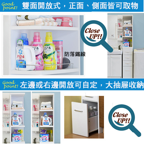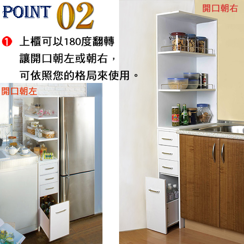 【超強功能隙縫收納櫃】可分為上下二座,上櫃共有三層收納空間,正面與側面共兩面開放式的設計,取物十分方便,並附防落鐵線,可以充分收納瓶瓶罐罐等廚房用品。為了符合您牆壁的位置,上櫃也可以180度翻轉,讓開口朝左或朝右,完全可以依照您的格局來擺放!