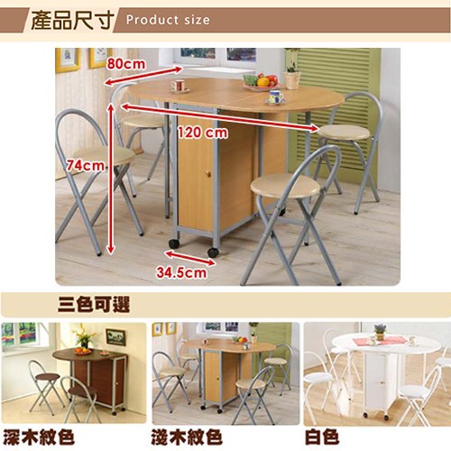 台灣精品回銷台灣,日本流行已久的橢圓折疊多用途蝴蝶桌椅組,整組商品包含《一桌》、《四椅》! 本體採用堅固的鐵管結構,兩側桌板可視需要翻開加大。打開一邊時,另一邊靠牆變半圓桌,放上PC可以當成個人工作站或是早餐吧台桌使用;左右均開時,是一個橢圓形桌面,最大寬度120公分。不使用時將左右桌板放下,寬度僅34.5公分,可當作小置物桌擺設小植裁或小飾品,也可置於牆邊、縫隙,方便收藏。附輪子的設計,移動自在、便利。