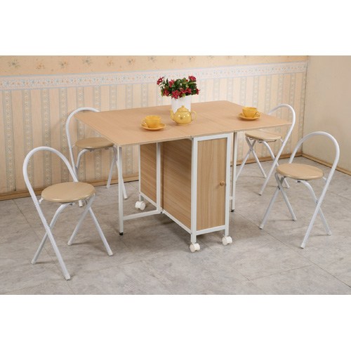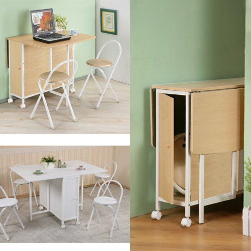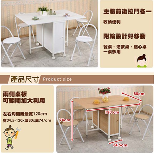 台灣精品回銷台灣,日本流行已久的方形折疊多用途蝴蝶桌椅組,整組商品包含《一桌》、《四椅》! 本體採用堅固的鐵管結構,兩側桌板可視需要翻開加大。打開一邊時,另一邊靠牆變小方桌,放上PC可以當成個人工作站或是早餐吧台桌使用;左右均開時,是一個方形桌面,最大寬度120公分。不使用時將左右桌板放下,寬度僅34.5公分,可當作小置物桌擺設小植裁或小飾品,也可置於牆邊、縫隙,方便收藏。附輪子的設計,移動自在、便利。
