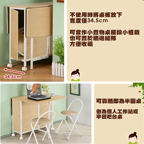 兩側桌板可視需要翻開加大,打開一邊時,另一邊可靠牆變方桌、工作桌、吧檯桌使用!怎麼利用都便利!