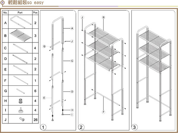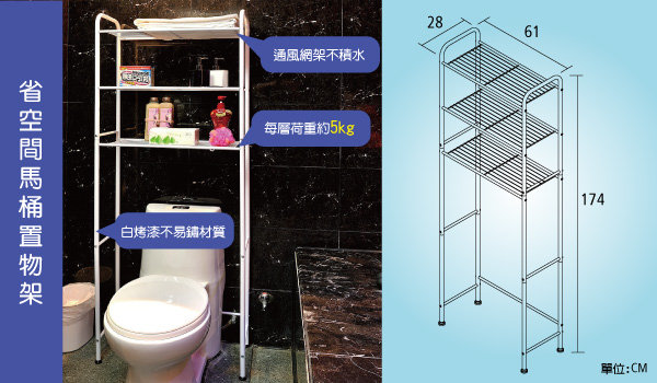這款《多功能馬桶置物架》100%台灣製造,結構穩固又耐用,設計簡單卻非常實用,DIY組裝程序輕鬆完成,擺放於馬桶或小型洗衣機上可有效利用上方的空間,大大的增加可使用空間外,置物架上方還可放置換洗衣物、衛生用品、毛巾等等,除此之外,美化盆栽以及雜誌書籍也可輕鬆收納,不破壞整體的美觀哦!