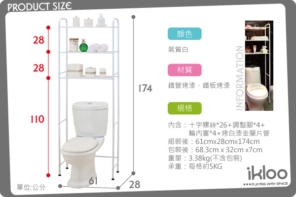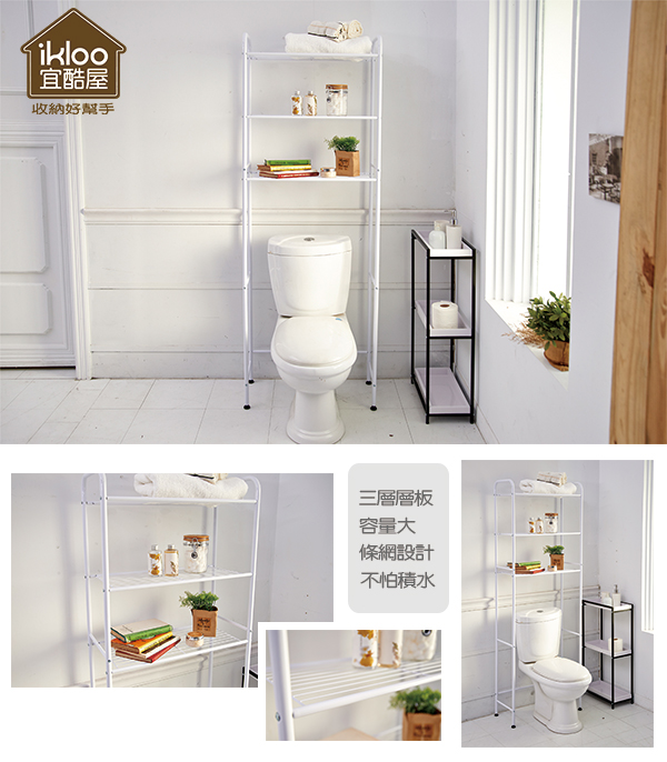 在忙碌一天之後,洗個澡讓自己好好的放鬆,這短暫的時光已是現代人的小確幸,乾淨清爽的衛浴空間肯定讓您幸福感加倍!在寸土寸金的時代,您的空間絕對值得IKLOO宜酷屋來細心規劃,不浪費任何可有效利用的空間,在此向您推薦此款《多功能馬桶置物架》,簡潔俐落的設計,適合喜歡簡約風格的您。