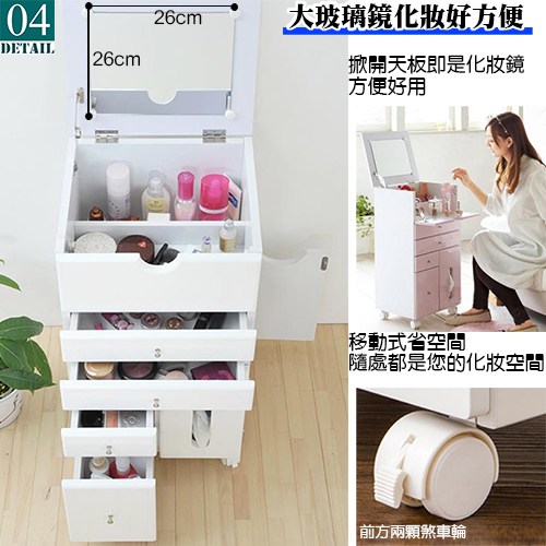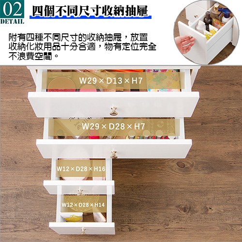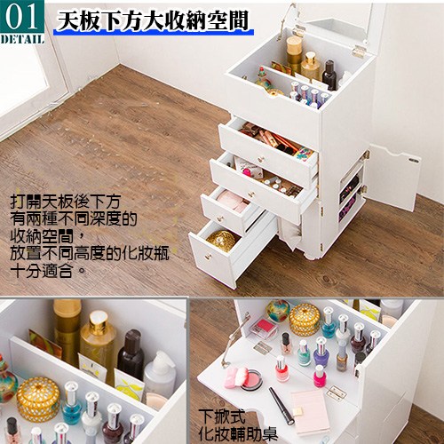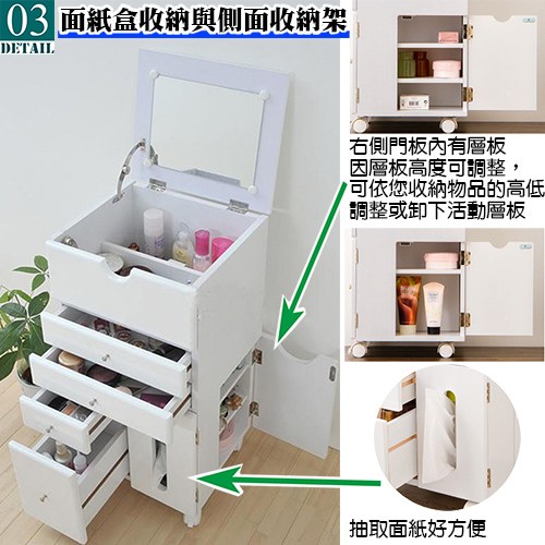 替完美女性做最貼心的設計是具備四種不同尺寸的抽屜,收納放置貼身用品、粉餅、眉筆、小首飾、化妝瓶,讓您能美得更有條不紊,既體貼又方便;特別的是在側面的拉門內部也設計了具兩個活動層板的收納空間•您可以根據自身的需要調整層板的高度,總高共27公分,讓本商品的收納功能又更進了一層;貼心的是正面的右邊設計有面紙收納空間,只要將面紙盒放入門內,使用時可以不用打開櫃子就能抽取面紙,您不用為了要使用面紙而到處奔走囉!