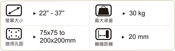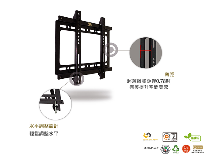 造型簡約大方、輕鬆DIY安裝、免拆螺絲快速調整水平、超薄離牆距離、電漿電視與牆面完美合。適用於市面上所有的LCD、LED顯示器,創造視覺的美感增加空間應用讓整體空間增添設計感。全系列使用高強度結構合金鋼,結合環保塗料烤漆處理,並通過SGS載重測試,在享受時尚新穎的同時兼具了生活的安全性。
