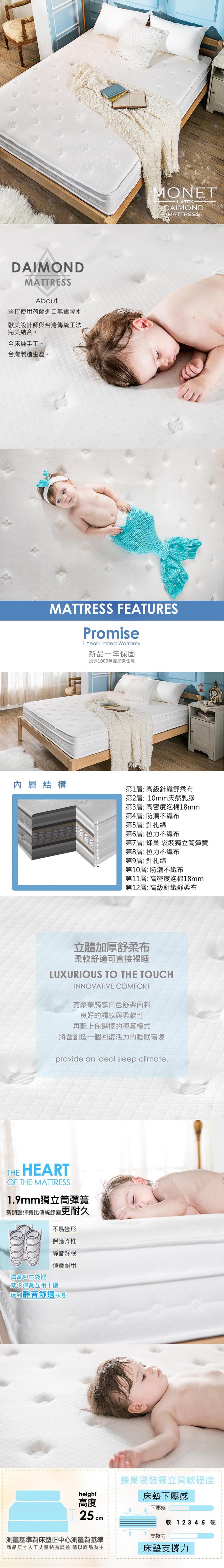 【obis】晶鑽系列_MONET三線乳膠獨立筒無毒床墊單人3.5*6.2尺