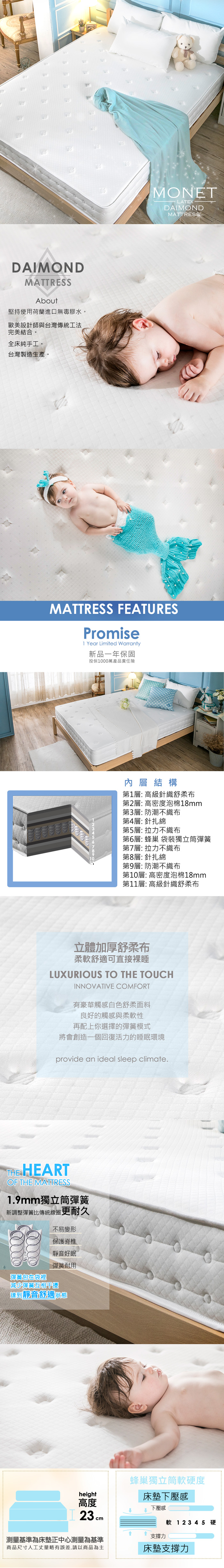 MG珍寶-3M防潑水抗菌高澎度-護邊蜂巢獨立筒床墊-雙人加大6尺