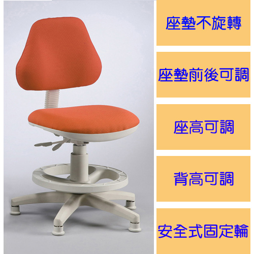 l 不旋轉固定式座面:座面固定不會旋轉,免除了家長所擔憂之旋轉帶來的危險以外,更能讓學童穩穩的安坐在椅子上,不會因旋轉嬉戲造成不專心,更避免椅背旋轉撞到桌面的情形!