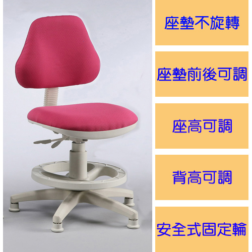 l 不旋轉固定式座面:座面固定不會旋轉,免除了家長所擔憂之旋轉帶來的危險以外,更能讓學童穩穩的安坐在椅子上,不會因旋轉嬉戲造成不專心,更避免椅背旋轉撞到桌面的情形!
